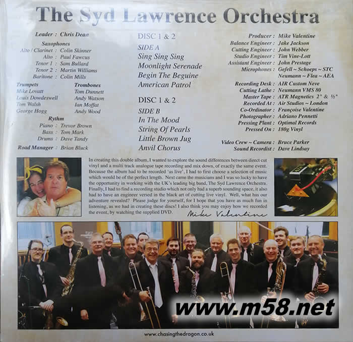 「席德勞倫斯樂團」於1967年由英國知名編曲家席德勞倫斯成立,1998年席德過世后,由伸縮號手克里斯丁恩繼續領軍。儘管現今Big Band已式微,該樂團依舊以完美默契,以及活潑又充滿幽默感的演奏風格,精彩演繹搖擺經典以及經典舞曲,讓人重溫格倫米勒、法蘭克辛那屈風采,連續八年獲選為「地球上最佳Big Band」! 在「Chasing The Dragon」直刻黑膠系列中,該樂團除了與爵士女伶蒂爾共同向一代歌后向艾拉費茲杰羅致敬,更在本片中獨挑大樑,使盡渾身解術大展 Big Band 的銅管魅力。為了讓大家體驗直刻唱片過人的魅力,本專輯包含了一片以直刻製成的 LP,另一片為經過多軌混音處理的 LP,同一時間,兩種不同錄音方式。此外,專輯中還附有 DVD,精彩記錄本專輯的錄音過程,帶領大家了解直刻唱片錄製的艱難之處,滿足發燒友對錄音的好奇!