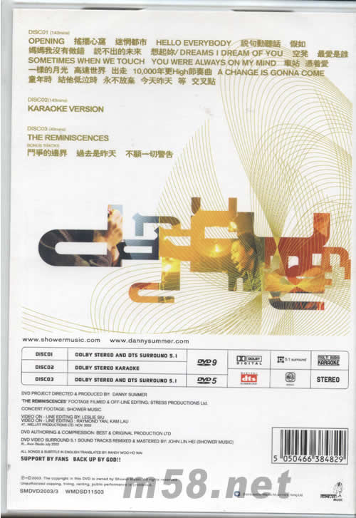 DISC 01 (143mins) 01. OPENING 02. 搖擺心窩 03. 迷惘都市 04. HELLO EVERYBODY 05. 說句動聽話 06. 假如 07. 媽媽我沒有做錯 08. 說不出的未來 09. 想起你/DREAMS I DREAM OF YOU 10. 空凳 11. 最愛是誰 12. SOMETIMES WHEN WE TOUCH 13. YOU WERE ALWAYS ON MY MIND 14. 車站 15. 憑著愛 16. 一樣的月光 17. 高速世界 18. 出走 19. 10,000年更High節奏曲 20. A CHANGE IS GONNA COME 21. 童年時 22. 結他低泣時 23. 永不放棄 24. 今天昨天 25. 等 26. 交叉點 DISC 02 (143mins) KARAOKE VERSION DISC 03 (49mins) THE REMINISCENCES BONUS TRACKS 斗爭的邊界 過去是昨天 不顧一切警告