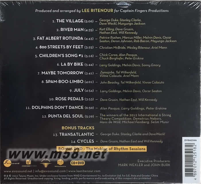 Rhythm Sessions 節奏情懷(m58.net) 每一首曲子都由不同的樂手組成,而且大都是樂壇大腕Lee Ritenour 真是大手筆啊!作為一名現代爵士吉他手甚至是Smooth Jazz吉他手,Lee Ritenour可能從來沒有放棄自己對爵士音樂的精華"即興表演"的追求, 也從來沒有一心沉迷于商業化的流行音樂中. 融合爵士是Lee Ritenour的老本行, 隨時玩玩Stright-ahead或是Smooth應該是蠻容易的, 而他在他的音樂職業道路上還真的就是這樣, 有點和Pat Metheny類似, 不過Lee Ritenour相對要保守一些, 主流一些。