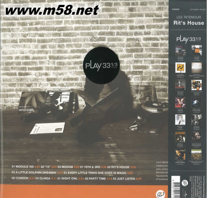 RIT'S HOUSE Features 爵士吉它手 45轉雙黑膠(m58.net) 作為一名現代爵士吉他手甚至是Smooth Jazz吉他手,Lee Ritenour可能從來沒有放棄自己對爵士音樂的精華"即興表演"的追求, 也從來沒有一心沉迷于商業化的流行音樂中. 融合爵士是Lee Ritenour的老本行, 隨時玩玩Stright-ahead或是Smooth應該是蠻容易的, 而他在他的音樂職業道路上還真的就是這樣, 有點和Pat Metheny類似, 不過Lee Ritenour相對要保守一些, 主流一些。
