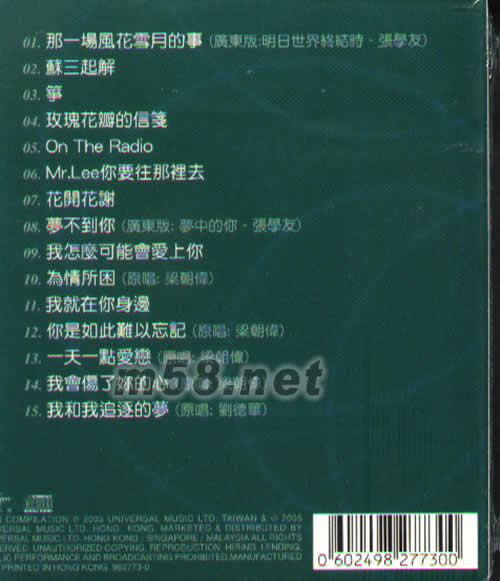 01. 那一場(chǎng)風(fēng)花雪月的事(廣東版:明日世界終結(jié)時(shí) -張學(xué)友) 02. 蘇三起解 03. 箏 04. 玫瑰花瓣的信箋 05. On The Radio 06. Mr.Lee你要往那里去 07. 花開花謝 08. 夢(mèng)不到你(廣東版:夢(mèng)中的你 -張學(xué)友) 09. 我怎么可能會(huì)愛(ài)上你 10. 為情所困(原唱:梁朝偉) 11. 我就在你身邊 12. 你是如此難以忘記(原唱:梁朝偉) 13. 一天一點(diǎn)愛(ài)戀(原唱:梁朝偉) 14. 我會(huì)傷了你的心(原唱:梁朝偉) 15. 我和我追逐的夢(mèng)(原唱:劉德華)