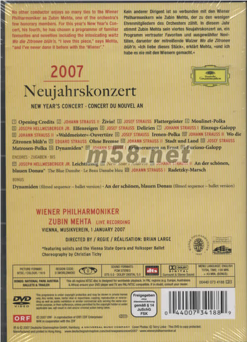 2007 NEW YEAR S CONCERT DVD 2007年新年演唱會(m58.net) 2007年新年演唱會DVD 梅塔指揮維也納愛樂樂團 真擊喜氣洋洋的音樂盛宴 梅塔ZUBIN MEHTA 四度登場! 維也納愛樂樂團澎湃演出史特勞斯嫡系名作16首 音樂會總全長逾100分鐘 DVD獨家片段:維也納國立歌劇院芭蕾舞蹈團優美演出