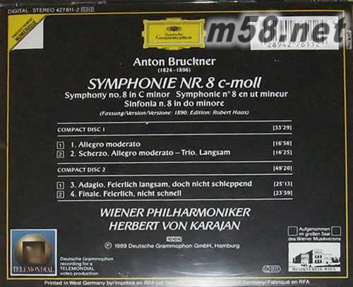 價格為估,以實到貨為準! 布魯赫納 第8交響曲 2CD(m58.net) 在交響史上,布魯克納的交響曲占據極重的地位,他是連接貝多芬與馬勒的橋梁,作為馬勒的恩師,他的作品是比較“健康”的。 卡拉揚的布魯克納真是越老越深沉。從早期在EMI的錄音,到DG 1970年代的二作馮婦,然后在最晚年仍然念念不忘,可見卡拉揚對布魯克納真的難以忘懷。他在慢板樂章所凝聚的音樂張力,精緻緊湊的弦樂與銅管部,將柏林愛樂催逼出無比瑰麗的音色。這是卡拉揚最偉大的錄音之一,也是布魯克納第八的首選版本。 企鵝三星帶花/留聲機世紀100大作/日本唱片名盤300,這種“三冠王”在古典唱片史上很少見的。 布魯克納的交響曲中成就最高的是第7和第8,氣勢磅礴、構思宏偉,內涵非常豐富,史詩性的作品。 總的來說第九“未完成”也是經典之作,少了第八中的憂郁、冥想,能感受到那種對生命的不懈。雖然布魯克納的作品非常的少,除了九首交響曲外再加上兩首后來找到的前期習作(0號和00號)交響曲,兩首彌撒曲等,就沒有了,但只有這些作品就足以確立他在古典音樂上的重要地位,和德奧音樂體系中承上啟下的的代表人。 就我個人來說,最喜歡的就是布魯克納的第八和第九了。(這東西不是我寫的,文章作者居然沒有寫第7,不知道他是不是忘了布魯克納還寫過一部叫做“Symphony #7 in E Major”的偉大作品,或者是沒聽過第7。) 布魯克納、馬勒的作品都很少,但其交響樂數量在他們所處的時代就不算少了!而且章章獨立成篇,他們專攻交響領域,無暇顧及其他體裁,這也充分保證了作品的質量。雖然同時代還有舒伯特、德沃夏克、勃拉姆斯等大師,但他們的交響曲從深度、廣度以及影響力來說,還有所欠缺。他們的室內樂、協奏曲等比交響成就要高,雜而不精啊! 布魯克納的作品宗教性太強,致使不太容易入手。但它龐大的構架,嚴謹的組織,不愧為Beethoven衣缽的繼承者。大家可以從第四“Romantic”先入手。 不少批評家說布魯克納交響曲結尾虎頭蛇尾,草草收場,這部第8就是最好的反擊! 第4樂章滂沱大氣,結構嚴密,精彩紛呈。大有壓倒之勢。 雖說交響曲不能拆開來聽,但我還是喜歡只聽第八的三四樂章,因為覺得只是這兩個樂章就能表現出完整的世界,尤其是第三樂章,他帶給你的感受決不是一般意義上的好聽,這是中緩緩升成的、無窮無盡的世界,在所有的交響曲中只有貝九的第三樂章才具有這樣的規模,表現出來的都是那種宇宙的永恒和個人的渺小??ɡ瓝P指揮的第八是我聽過的最好版本,我以前形容過這首交響曲對我來說是“溫暖”的,維也納愛樂的金色的音響也更加完美的突出了這一點。布魯克納的音樂或許難懂,但你認真傾聽,你就能體會到音樂中細膩的情感.