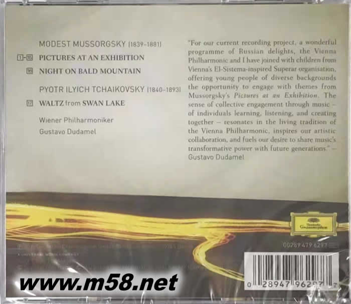 穆索爾斯基:圖畫展覽會 Mussorgsky: Pictures At An Exhibition(m58.net) 作為Deutsche Grammophon的獨家錄音藝術家慶祝十周年,Gustavo Dudamel的職業生涯已從委內瑞拉Wunderkind演變為世界上最杰出和最受歡迎的Maestros之一。他即將錄制的唱片是2016年4月在維也納音樂博物館(Musikverein)與維也納愛樂樂團(Wiener Philharmoniker)一起制作的,是全俄羅斯的專輯-結合了Mussorgsky的兩幅作品,Ravel宏偉的編排中的Pictures at a Exhibition,以及Bald Mountain的A Night on Bald,柴可夫斯基天鵝湖上著名的華爾茲舞。維也納華爾茲國王和達達梅爾(Dudamel)使這個常年的芭蕾舞劇著重于新鮮,生機勃勃的新讀物-完美地介紹了節日季節。展覽中的圖片是音樂中轉錄最完整,排列最整齊的作品之一,是音樂的試金石,啟發了許多藝術家