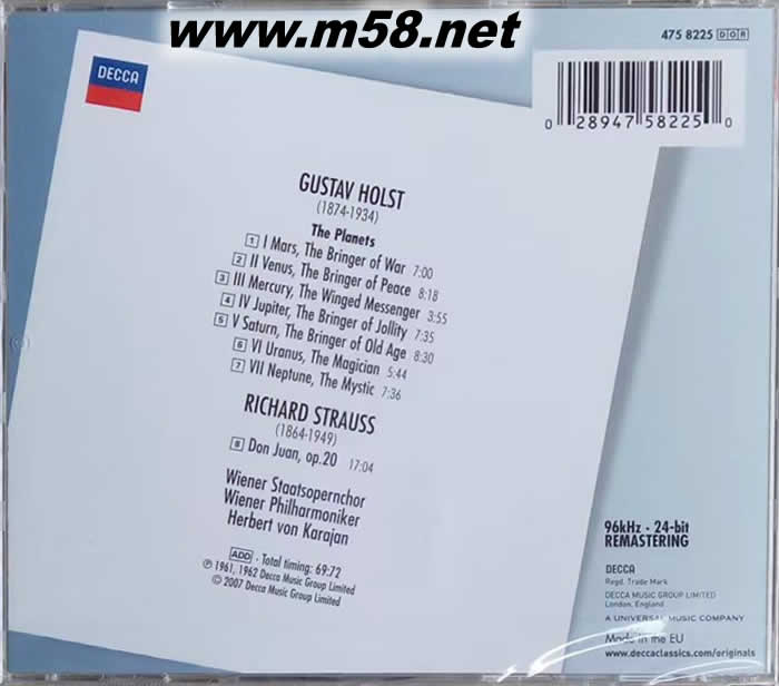 卡拉揚指揮 霍爾斯特 行星組曲 Karajan - Holst: The Planets 大禾花版(m58.net) 《霍爾斯特:行星組曲》由卡拉揚指揮維也納愛樂樂團演奏灌錄,Decca唱片公司再版發行于2007年。這份錄音讓霍爾斯特《行星組曲》由英國樂團曲目晉身為國際樂壇的重要曲目,當年的黑膠唱片備受《留聲機雜志》贊賞,稱卡拉揚的絕對精彩演出賦予《行星組曲》新的生命。卡拉揚60年代與維也納愛樂的合作,將本輯中《行星組曲》的內蘊演繹發揮得淋漓盡致,是當代最具代表性的典范演出。而這份錄音更讓霍爾斯特的《行星組曲》由英國樂團的曲目,晉身為國際樂壇的重要曲目。本輯的錄音華麗飽滿,與演出相輔相成,不愧為當年Decca錄音技藝的最高成就。 霍爾斯特的《行星組曲》是一部龐然巨著,整個作品分為七個樂章,分別以九大行星中的七個星球命名,而且樂隊編制也異常龐大,啟用了一般很少登臺的低音長笛、低音雙簧管、低音單簧管、低音大管、次中音大號等管樂器,以及管風琴和眾多的打擊樂器,在最后一個樂章中還有一段六聲部的女聲合唱(有時亦以兩支獨奏長笛取代)。如此眾多的樂器的組合產生了豐富的音響色彩,如在火星樂章的一段音樂中,樂隊的全奏展示出了地動山搖的氣勢。但也許正是由于《行星組曲》本身及其樂隊編制過于龐大,這部作品一般很少全曲演奏,通常僅演其中的三、五個樂章,有時則只是單獨演奏一個樂章。 赫伯特?馮?卡拉揚的指揮動作灑脫、大方、氣勢磅礴,并以準確和客觀著稱,是一位力圖把富特文格勒與托斯卡尼尼的指揮風格融為一體的指揮家,他的指揮極富激情,追求磅礴的氣勢,追求對音響力度的變化及音樂線條的勾劃,在樂隊的音色處理上,偏愛于流暢、圓潤、透明的效果。他常常通過極端的漸強、漸弱對比來突出作品的戲劇化效果,所以是結構上最精致的一位演繹者。在他的領導下,柏林愛樂樂團展現出了一種有如金屬般的亮色,被譽為卡拉揚“音響”。正是他的音樂天賦,加上對樂曲的正確理解和對樂隊的嚴格要求,卡拉揚的演出總能達到超常出眾的藝術水平。