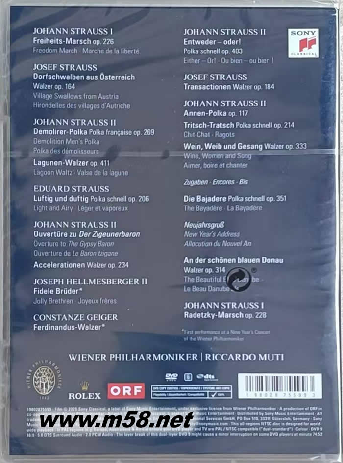 2025 New Year's Concert 2025 維也納新年音樂(lè)會(huì) DVD歐版(m58.net) 里卡多•穆蒂在維也納愛(ài)樂(lè)樂(lè)團(tuán) 50 多年的歷史中扮演著重要角色。 與穆蒂大師的藝術(shù)合作始于 1971 年。 自那時(shí)起,他已與樂(lè)團(tuán)合作演出了 500 多場(chǎng)音樂(lè)會(huì), 其中包括六場(chǎng)新年音樂(lè)會(huì)、愛(ài)樂(lè)樂(lè)團(tuán)訂閱音樂(lè)會(huì)、紀(jì)念音樂(lè)會(huì)、 薩爾茨堡音樂(lè)節(jié)年度管弦樂(lè)音樂(lè)會(huì)、客座演出和巡演以及眾多歌劇作品。 自 2011 年起,他成為維也納愛(ài)樂(lè)樂(lè)團(tuán)的榮譽(yù)成員。