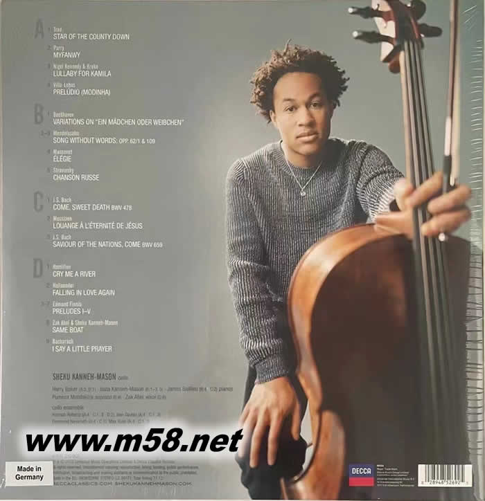 SONGS 大提琴 黑膠(m58.net) 英國大提琴家梅森是第一位獲BBC年度青年音樂家獎殊榮的黑人音樂家。從天才家庭走出的梅森有著驚人的天賦,他對他的音樂的激情令人難以置信。最新專輯演奏多首經典古典及流行作品:馬斯奈悲歌、門德爾松無詞歌、南方城鎮的星子等,180克雙彩膠限量發行。