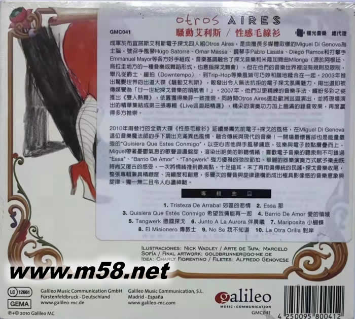 TRICORA(m58.net) 成軍於布宜諾斯艾利斯電子探戈四人組OtrosAires,是由擅長多媒體取樣的Miguel Di Genova為主腦,號召手風琴Hugo Satorre、Omar Massa、鋼琴手Pablo Lasala、Diego Ramos和打擊手Emmanuel Mayor等各方好手組成。音樂基調融合了探戈音樂和米隆加舞曲Milonga(源於阿根廷、烏拉圭地方的一種音樂或舞蹈形式,也意指探戈舞會),但在他們的音樂世界里沒有規則及限制,舉凡從爵士、緩拍(Downtempo)、到Trip-Hop等樂風皆可巧妙和諧地糅合在一起。2003年推出驚艷世界的出道大碟《騷動艾利斯》,散發出令人無法抗拒的電子探戈氛圍魅力,甫出道即被傳媒譽為「廿一世紀探戈音樂的領航者!」。2007年,他們以更精練的音樂手法、繽紛多彩之姿推出《雙人熱舞》,依舊獲得樂評一致好評。 每回進化總令樂迷驚呼傳媒讚嘆的Otros Aires,成軍至今不斷嘗試融入更多電子節奏以及探戈元素,2007年遠赴歐洲巡迴演出后精華集結而成的第三張專輯《Live巡迴超精選》,試圖將前兩張專輯暢銷作品結合並重新編曲,賦予嶄新的音樂生命。開場三首熱力四射,改編自探戈歌王Carlos Gardel的作品“Milonga Sentimental”、“Sin Rumbo”和“Rotos En El Raval”一波波畫龍點睛令人屏息的電氣節奏LOOP與綿密的演唱情緒醞釀出細膩而美妙的新探戈情境詩篇,再再令人陶醉不已;喜愛緩拍與拼貼型態節奏的樂迷則不可錯過“Allerdings Otros Aires”、 “Amor Que Se Baila”和“Barrio De Tango”,一直到結尾特別加收混音版本“Allerdings Otros Aires”展現了Miguel Di Genova操盤混音的絕佳功力。這是一場絕無冷場的新世紀時尚探戈饗宴,一張打破音樂界線再生混種新文化的作品,以Otros Aires標幟性的強大創作手法,讓樂迷用耳朵親自體驗從中併發的無限感動,《Live巡迴超精選》充滿了精彩的戲劇張力,精采的演奏功力加上飽滿的錄音效果,再度贏得多方推崇。