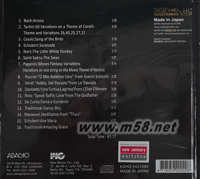 1. Arioso 巴哈:G弦之歌 2. 50 Variations on a Theme of Corelli-Theme and Variations 26, 45, 25, 27, 11 塔替尼:柯賴里主題與變奏 3. Song Of The Birds 卡薩爾斯:天鵝之歌 4. Serenade 舒伯特:小夜曲 5. The Little White Donkey 艾伯特:小白驢 6. The Swan 圣桑:天鵝 7. Moses Fant Vars 帕格尼尼:摩西幻想變奏曲 8. Gianni Schicchi: O Mio Babbino 親愛的爸爸(普契尼:「姜尼.史基基」) 9. La Traviata: Addio, Del Passato 永別了,往昔(威爾第:「茶花女」) 10. Una Furtiva Lagrima, L'Elisir D'Amore 一滴美妙的情瓷]董尼采第:「愛情靈藥」) 11. Speak Soflty Love, The Godfather 「教父」主題曲「輕輕說愛」 12. Torna A Surriento 迪.科提斯:哭泣的男人 13. Danny Boy 丹尼男孩 14. Meditation, Tha?s 馬斯奈:泰綺思暝想曲 15. Ave Maria 舒伯特:圣母瑪莉亞 16. Amazing Grace 奇異恩典