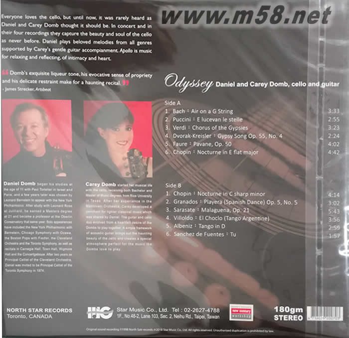 APOLLO 阿波羅第二集 大提琴與吉他 LP黑膠(m58.net) 提琴家丹尼爾是托特里耶與皮亞第果夫斯基兩位大提琴名家的高徒,他的琴音流暢而自然,聽起來輕松而沒有壓力。這張「阿波羅」改編許多著名音樂,例如卡薩爾斯的「天鵝之歌」、圣桑的「天鵝」、普契尼的「親愛的爸爸」、舒伯特的「小夜曲」與「圣母頌」、馬斯奈的「泰綺思暝想曲」,還有傳統民謠「丹尼男孩」等等,每一首都是美得令人傾心的好音樂。錄音本身豐腴圓潤而細節清晰,大提琴拉奏時的松香質感四處飄逸,可謂大提琴美聲錄音的發燒典范。 大提琴與鋼琴的合奏我想古典樂迷聽很多了,大提琴與吉他的合奏呢?很少聽到吧!好聽嗎?好聽!尤其是當夜深人靜、自己一個人啜飲清茶或享受著濃純咖啡香時更為適合。在此介紹一張百聽不厭的大提琴與吉他合奏CD:Apollo。在這張CD之前,我很少去注意到大提琴與吉他的合奏是否搭調的問題。聽過這張CD之后,我才驚覺原來大提琴與吉他竟然也是這么搭調... 【音響論壇177 期劉漢盛總編私房CD】 音響論壇總編劉漢盛:「吉他大部分時候只負責輕柔的伴奏,讓大提琴擦弦質感與鼻音的魅力悠悠然在耳際縈繞時,那種毫無壓力的音樂美感真的讓人通體舒暢。」