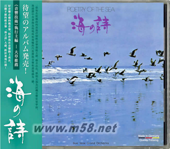 價格為估,以實到貨為準! 海之詩 Poetry of the Sea(m58.net) 一張知名度極高的浪漫抒情輕音樂發燒天碟 日本 JVC 制作,音色飽滿,立體聲強,發燒友視為試機音響準則。 陣陣的海濤聲中夾著海鳥中的鳴叫和海輪的汽笛聲與音樂和諧地融為一體, 讓你彷彿置身于海邊。感受回到了自己的青蔥歲月。 音響技術 執行主編 --大草 : 「好音響必備的靚音樂。陪伴我在音響路上成長,百聽不厭的輕音樂 "海之詩" 大碟,終于重現江湖! 」