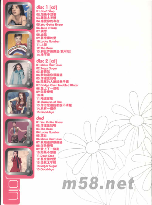 DISC 1 CD 01. Don't Stop 02. 如果不想要 03. 怪我太年輕 04. 感覺你的存在 05. You Gotta Know 06. Take it Easy 07. 猜想 08. 由我 09. 什么樣的愛 10. Lucky Number 11. 上街 12. The Rose 13. 和世界做鄰居(我可以) 14. 舍不得 DISC 2 CD 01. Show Your Love 02. Sugar Sugar 03. 看緊我 04. 我知道你很難過 05. 你還愛我嗎 06. 孤單的人總說無所謂 07. Bridge Over Troubled Water 08. 愛上了一條街 09. 你快樂嗎 10. 嗨 11. 唱這首歌 12. Because of You 13. 你怎么連話都說不清楚 14. 只有一個你 15. Good-bye DVD 01. You Gotta Know 02. 你還愛我嗎 03. The Rose 04. Lucky Number 05. 空白 06. Show Your Love 07. 我知道你很難過 08. 你快樂嗎 09. 愛上了一條街 10. 如果不想要 11. Don't Stop 12. 什么樣的愛 13. 怪我太年輕 14. Sugar Sugar 15. Good-bye