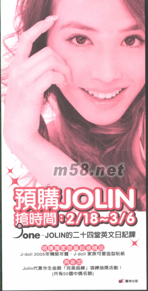 超值附贈 1.72句英文作文必用黃金J句 2. Jolin親自錄音英文朗讀光盤 3.英文單字隨身實用復習卡 預購加贈 1.J-doll 家族可愛造型貼紙‧ 2.Jolin 2005年精裝年歷