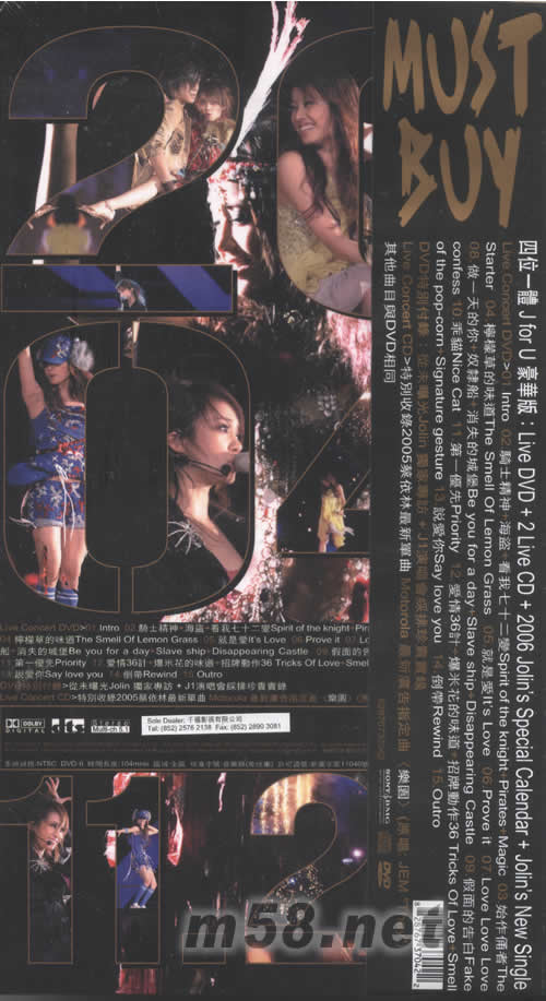 J1式LIVE CONCERT演唱會影音全記錄(套裝豪華版)(m58.net) 產(chǎn)品長*寬*高=25.5*24.4*2CM DVD-9 Jolin蔡依林首次個人演唱會J1影音全記錄 華人音樂史上最強Live DVD 決定保存版 絕贊超值一次收藏:J1 Live DVD + 2 Live CD + 2006 Jolin專屬全新年歷+最新單曲 外加寫真式大歌詞本 華人音樂演唱會創(chuàng)舉:首次使用HDTV高規(guī)格制作技術(shù)、HDTV 高解析度現(xiàn)場攝影、超高解析度影像壓縮 5.1 DTS surround (1536K)、5.1 DOLBY DIGITAL,絕對臨場視覺精采超享受! CD特別收錄手機最新廣告主題曲∶「樂園」 2004年11月 蔡依林 Jolin 首次個人演唱會《J1》臺北演唱會,耗資1,200萬臺幣重金打造臺灣首創(chuàng)百老匯劇院式舞臺,十個豪華大場景,讓Jolin百變造型及熱歌勁舞火力全開,一氣呵成的新舊成名曲呈獻(xiàn)給觀眾,保證讓歌迷目不暇給,驚喜連連,一一收錄在這張《J1 演唱會》DVD+2CD影音全記錄內(nèi)! 出道五年,Jolin首次在自己的家鄉(xiāng)開唱,兩個小時Jolin在臺上的勁歌熱舞,完全沒有冷場的演出;她以十套特色的造型裝束登相,甫開場Jolin穿著高貴的水鉆長襪從水晶燈里出場,以「Prove it」開始,艷驚四座,接著蔡依林又化身人魚公主和性感貓女給歌迷呈獻(xiàn)出她的高貴以及野性的截然不同的造型唱出「愛情36計」、「消失的城堡」、「海盜」、「假面的告白」等,百變功力發(fā)揮到淋漓盡致,令人看了大飽眼福。 這次舞臺總監(jiān)陳鎮(zhèn)川更向高難度挑戰(zhàn),為了讓演唱會呈現(xiàn)「復(fù)古華麗風(fēng)」主題,達(dá)到「人臺合一」的最高境界,打造國內(nèi)首創(chuàng)了百老匯式舞臺,讓Jolin可以在舞臺上完美呈現(xiàn)的歌舞;并配合演唱會內(nèi)容主題,更設(shè)計變換十個不同場景以及華麗特效,可說是「十景變換、十面埋伏」,絕對讓歌迷眼花撩亂!Jolin在「J1」臺北演唱會CF化身super model,并在特別獨秀一段已經(jīng)練了半年多的瑜珈,請歌迷拭目以待!
