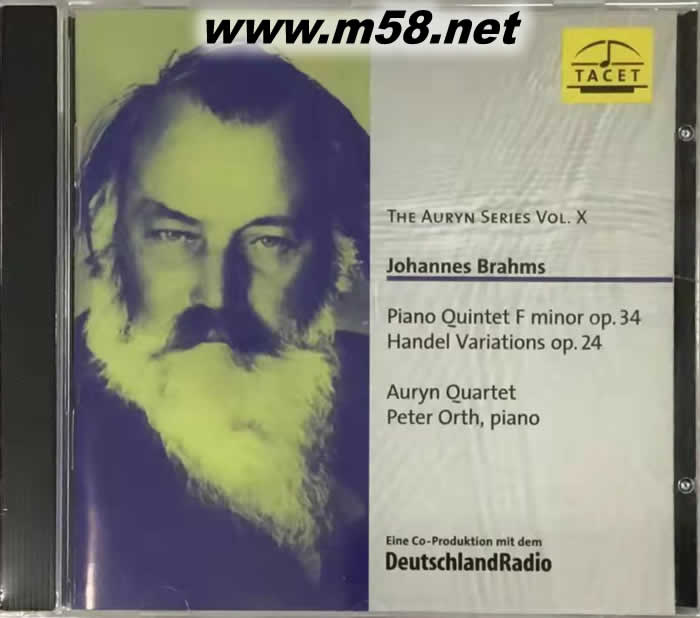 BRAHMS 勃拉姆斯:鋼琴F調四重奏(m58.net) 倫(Auryn)系列10包含勃拉姆斯(Johannes Brahms )F調鋼琴慢板四重奏以及亨德爾(Handel)變奏曲。特點:環繞立體聲96kHz, 24 bit適合任何DVD聲效系統純音樂只能在DVD機上播放,普通CD機不能播放樂手:奧倫四重奏:林根菲爾德 (Matthias Lingenfelder), 第一小提琴手第二小提琴手歐佩曼(Jens Oppermann),第二小提琴手伊頓(Stewart Eaton) 中提琴手安德特(Andreas Arndt)大提琴手彼得•奧斯(Peter Orth)鋼琴