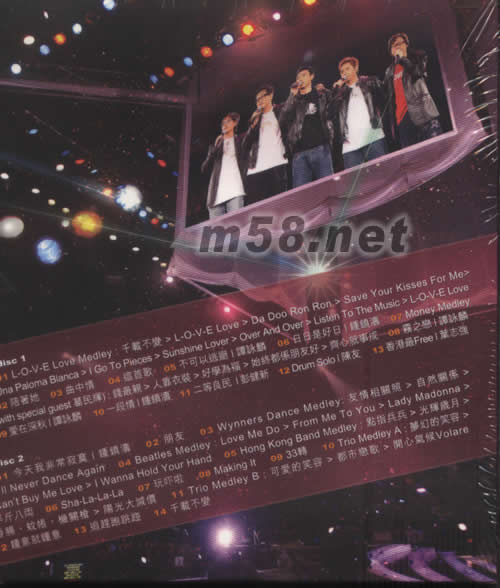 1.L-O-V-E love MEDLEY:千載不變 L-O-V-E love>DA DOO RON RON>SAVE YOUR KISSES FOR ME>UNA PALOMA BLANCA>I GO TO PIECES>SUNSHINE LOVER>OVER AND OVER>LISTEN TO THE MUSIC>L-O-V-E love 2.陪著她 3.曲中情 4.這首歌 5.不可以逃避-譚詠麟 6.日日是好日-鐘鎮濤 7.MONEY MEDLEY(WITH SPECIAL GUEST 葛民輝):錢最親>人靠衣裝>>好學為福>始終都是朋友好>齊心就事成 8.霧之戀-譚詠麟 9.愛在深秋-譚詠麟 10.一段情-鐘鎮濤 11.二等良民-彭健新 12.DRUM SOLO-陳友 13.香港最FREE-葉志強 DISC 2 1.今天我非常寂寞-鐘鎮濤 2.朋友 3.WYNNERS DANCE MEDLEY:友情相關照 >自然關系>I'II NEVER DANCE AGAIN 4.BEATLES MEDLEY:LOVE ME DO>FROM ME TO YOU>LADY MADONNA>CAN'T BUY ME LOVE>I WANNA HOLD YOUR HAND 5.HONG KONG BAND MEDLEY:點指兵兵>光輝歲月>半斤八兩 6.SHA -LA-LA-LA 7.玩嚇啦 8.MAKING IT 9.33轉 10.TRIO MEDLEY A:夢幻的笑容>香腸\蚊賬\機關槍>陽光大減價 11.TRIO MEDLEY B:可愛的笑容>都巿戀歌>關心氣候VOLARE 12.鐘意就鐘意 13.追趕跑跑碰 14.千載不變