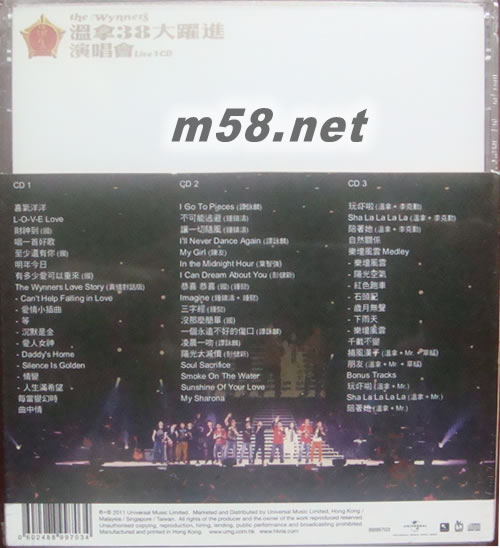 38載樂壇風云 溫拿2011大躍進演唱會 3CD收錄四十多首精彩好歌 再度領略樂壇光輝 CD 1 01. 喜氣洋洋 02. L-O-V-E Love 03. 財神到 (國) 04. 唱一首好歌 05. 至少還有你 (國) 06. 明年今日 07. 有多少愛可以重來 (國) 08. The Wynners Love Story (真情對話版) i. Can’t Help Falling in Love ii. 愛情小插曲 iii. 等 iv. 沉默是金 v. 愛人女神 vi. Daddy’s Home vii. Silence Is Golden viii. 情變 ix. 人生滿希望 09. 每當變幻時 10. 曲中情 CD 2 01. I Go To Pieces (譚詠麟) 02. 不可能逃避 (鍾鎮濤) 03. 讓一切隨風 (鍾鎮濤) 04. I’ll Never Dance Again (譚詠麟) 05. My Girl (陳友) 06. In the Midnight Hour (葉智強) 07. I Can Dream About You (彭健新) 08. 恭喜 恭喜 (國) (鍾懿) 09. Imagine (鍾鎮濤 + 鍾懿) 10. 三字經 (鍾懿) 11. 沒那麼簡單 (國) 12. 一個永遠不好的傷口 (譚詠麟) 13. 凌晨一吻 (譚詠麟) 14. 陽光大減價 (彭健新) 15. Soul Sacrifice 16. Smoke On The Water 17. Sunshine Of Your Love 18. My Sharona CD 3 01. 玩嚇啦 (溫拿 + 李克勤) 02. Sha La La La La (溫拿 + 李克勤) 03. 陪著她 (溫拿 + 李克勤) 04. 自然關系 05. 樂壇風云Medley i. 樂壇風云 ii. 陽光空氣 iii. 紅色跑車 iv. 石頭記 v. 歲月無聲 vi. 下雨天 vii. 樂壇風云 06. 千載不變 07. 捕風漢子 (溫拿 + Mr. + 草蜢) 08. 朋友 (溫拿 + Mr. + 草蜢) Bonus Tracks: 09. 玩嚇啦 (溫拿 + Mr.) 10. Sha La La La La (溫拿 + Mr.) 11. 陪著她 (溫拿 + Mr.)