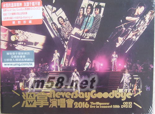 Never Say Goodbye演唱會 The Wynners Live In Concert 2016 DVD+CD(m58.net) 溫拿 (歌手)溫拿樂隊縱橫香港樂壇42年,2016年農歷新年在紅館舉行《Never Say Goodbye演唱會》,演唱會主題曲「溫拿精神」由譚詠麟與Mr.合作,見證五虎繼續發揚溫拿勵志精神,友情不變,以歌名粉碎解散的消息。五子甫出場唱出多首經典英文歌,又感性地分享當年分開發展的點滴,全晚50多首的曲目全部都是陪著樂迷成長的歌曲,舞蹈設計都以簡單易記為主,為新歌「Friend過打Band」自創舞步,與臺下歌迷一齊互動起舞添熱鬧氣氛。 The Wynners Live In Concert 2016 溫拿Never Say Goodbye演唱會 高規格制作3CD+3DVD版本 超過170分鐘精彩演出全程收錄.全高清拍攝五十多首作品