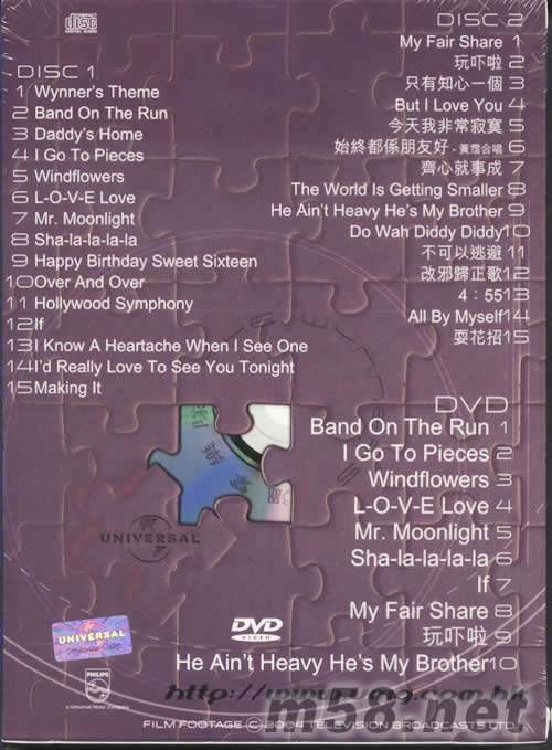DISC 1 01. Wynner s Theme 02. Band On The Run 03. Daddy s Home 04. I Go To Pieces 05. Windflowers 06. L-O-V-E Love 07. Mr.Moonlight 08. Sha-la-la-la-la 09. Happy Birthday Sweet Sixteen 10. Over And Over 11. Hollywood Symphony 12. If 13. I Know A Heartache When I See One 14. I d Really Love To See You Tonight 15. Making It DISC 2 01. My Fair Share 02. 玩嚇啦 03. 只有知心一個 04. But I Love You 05. 今天我非常寂寞 06. 始終都系朋友好 -黃沾合唱 07. 齊心就事成 08. The World Is Getting Smaller 09. He Ain t Heavy He s My Brother 10. Do Wah Diddy Diddy 11. 不可以逃避 12. 改邪歸正歌 13. 4:55 14. All By Myself 15. 耍花招 DVD 01. Band On The Run 02. I Go To Pieces 03. Windflowers 04. L-O-V-E Love 05. Mr.Moonlight 06. Sha-la-la-la-la 07. If 08. My Fair Share 09. 玩嚇啦 10. He Ain t Heavy He s My Brother