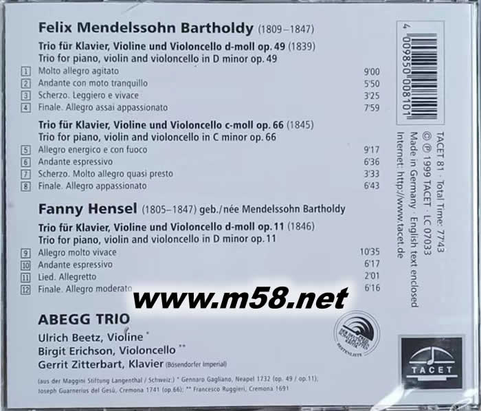 門德爾松 三重奏 鋼琴、大提琴、小提琴(美女封面)專輯背面圖片