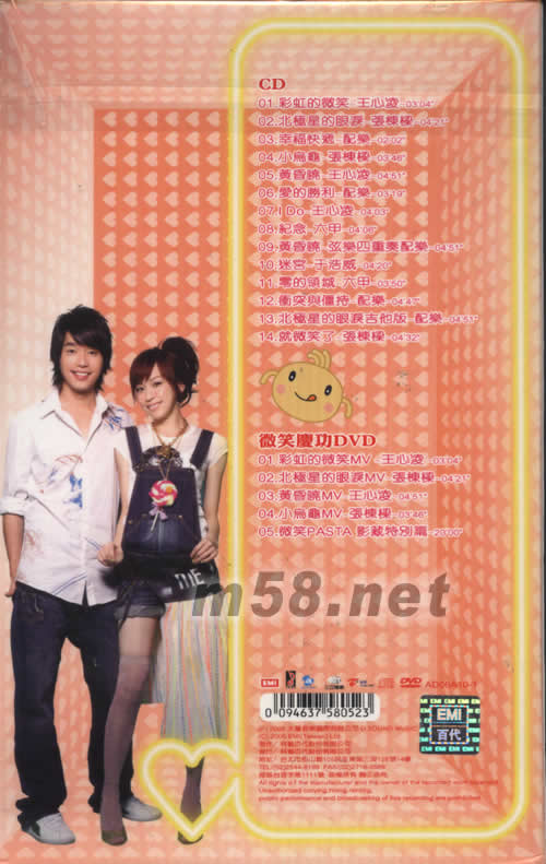 微笑電視原聲帶慶功版(m58.net) [微笑LOVE STORY]彩頁故事寫真1本PASTA超人微章組2枚(一套4款) 心棟夢幻組合 王心凌 張棟梁 主演/主唱 個性樂團六甲 潛力新人于浩威 原味好歌動人配樂 14首完整收錄 微笑慶功版 絕贊超值珍藏禮 DVD 4首完整MV:1.彩虹的微笑 2.北極星的眼淚 3.黃昏曉 4.小烏龜 20分鐘精彩獨家:微笑PASTA影藏特別篇