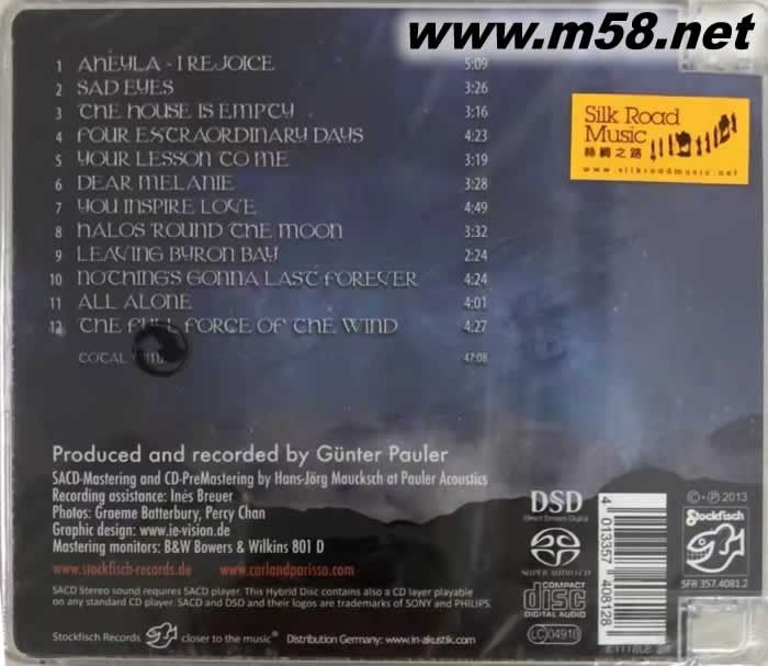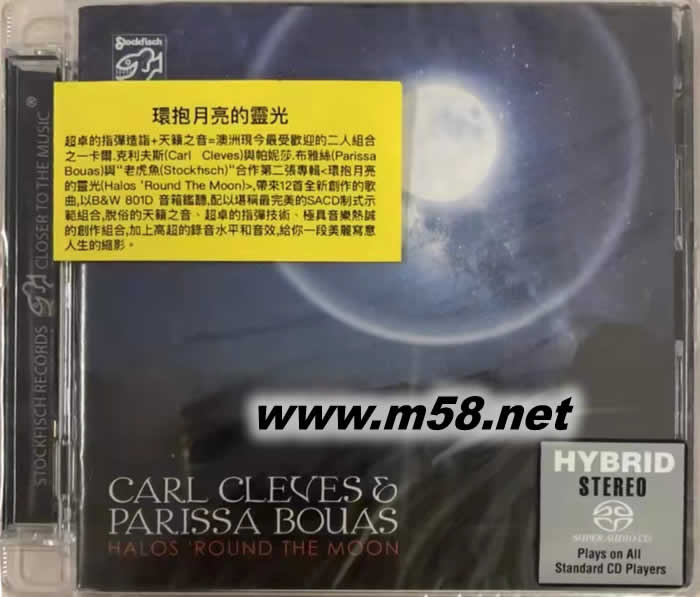 環(huán)抱月亮的靈光 Halos Round the Moon 月暈 SACD(m58.net) 卡爾克利夫斯及帕妮莎布雅絲《環(huán)抱月亮的靈光》SACD,澳洲現(xiàn)今最受歡迎的二人組合,有著超卓的指彈加天籟之音,與老虎魚合作的第二張專輯,12首全新創(chuàng)作大碟。極具音樂熱誠的創(chuàng)作組合加上高超的錄音水平,給你一段美麗寫意人生的縮影。