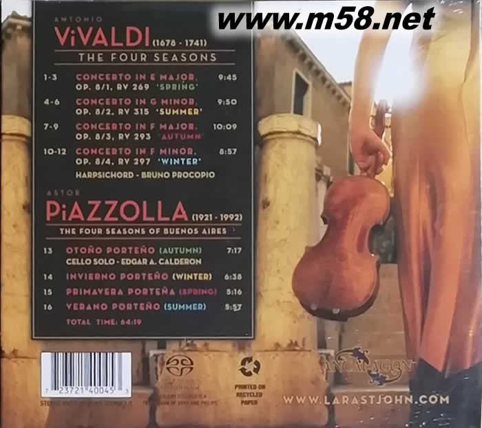 維瓦爾第:四季、皮耶佐拉:布宜諾思艾利斯的四季 VIVALDI PIAZZOLLA SACD 劉漢盛推介 100擊(m58.net) Lara St. John出生於加拿大,使用1779年制的「莎拉布」瓜奈里名琴,堪稱現代最性感的女小提琴手菈菈圣薔,曾於主流廠牌新力旗下發表過一張專輯,隨后便以自己的寵物蜥為名建立起個人唱片品牌Ancalagon。此回挑戰古典樂小提琴家的標準曲韋瓦第:「四季」,同時頗具巧思的加入探戈之父皮耶佐拉:「布宜諾思艾利斯的四季」,合奏出絕美的八季景色。并請來曾與潔西諾曼、阿勞、賽門拉圖、馬利納等多位古典樂大師合作過的Martha de Francisco擔任專輯制作人。專輯中菈菈圣薔簡潔卻眩目神迷的運弓技法搭配起SACD 5聲道的發燒級錄音規格,就連權威音樂網站AMG在整張專輯的表現與聲音水準上也只能臣服送出4星半超高評價,而知名發燒音樂網站Audiophile Audition與American record Guide等專業音樂傳媒都給予極高正面評價。