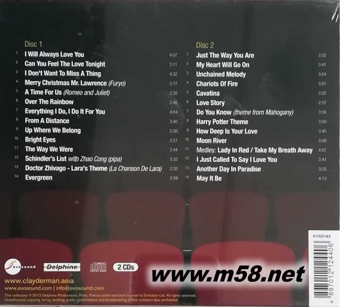 CD 1 1. I Will Always Love You 2. Can You Feel The Love Tonight 3. I Don't Want To Miss A Thing 4. Merry Christmas Mr Lawrence (Furyo) 5. A Time For Us - Romeo And Juliette 6. Over The Rainbow 7. Everything I Do I Do It For You 8. From A Distance 9. Up Where We Belong 10. Bright Eyes 11. The Way We Were 12. Schindler’S List With Zhao Cong 13. Doctor Zhivago-Lara's Theme « La chanson de Lara » 14. Evergreen CD 2 1. Just The Way You Are 2. My Heart Will Go On 3. Unchained Melody 4. Chariots Of Fire 5. Cavatina 6. Love Story 7. Do You Know (Theme From Mahogany) 8. Harry Potter Melody 9. How Deep Is Your Love 10. Moon River 11. Medley: Lady In Red /Take My Breath Away 12. I Just Called To Say I Love You 13. Another Day In Paradise 14. May It Be 光盤1 1.我將永遠愛你 2.你能感受到今晚的愛嗎 3.我不想錯過任何事情 4.圣誕快樂勞倫斯先生(Furyo) 5.我們的時光-羅密歐與朱麗葉 6.在彩虹之上 7.我為您所做的一切 8.從遠處 9.上屬于我們的地方 10.明亮的眼睛 11.我們的方式 12.迅達在趙聰的名單 13.日瓦戈-拉拉醫生的主題《拉香頌·拉拉》 14.常綠 CD 2 1.就是你的方式 2.我的心會繼續前進 3.解脫的旋律 4.戰車 5.卡瓦蒂娜 6.愛情故事 7.你知道嗎(桃花心木主題) 8.哈利·波特旋律 9.你的愛有多深 10.月亮河 11.混合泳:紅衣女郎/帶走我的呼吸 12.我只是打電話說我愛你 13.天堂的另一天 14.可能是