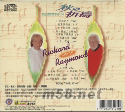 價格為估,以實到貨為準! 秋的祈禱(m58.net) 理查之年度浪漫巨獻 鋼琴王子理查與輕音樂大師雷蒙 的詩情相遇 理查與雷蒙·拉斐爾大樂團共譜 之唯美情詩:[祈禱][荒城之月] [櫻花]、、、等13首詩意翩翩的知名日本歌謠 惹您纏綿動心、、、 初秋,楓紅,繾綣情調.浪漫,詩情,大師風范. 對輕音樂迷而言,兩位如同浪漫樂界"天神"的音樂家能夠同一演出,若將之比為奇跡絕不為過.理查向以[鋼琴王子]著稱,而雷蒙·拉斐雨所指揮的大樂團,在輕音樂界更是與波雨瑪麗亞,詹姆斯拉斯特 共享盛名! 13首詩意翩翩的日本抒情小品,在兩位大師精心 合作的呈現之下,益發散漫著令人難以抗拒的聽賞 魅力.