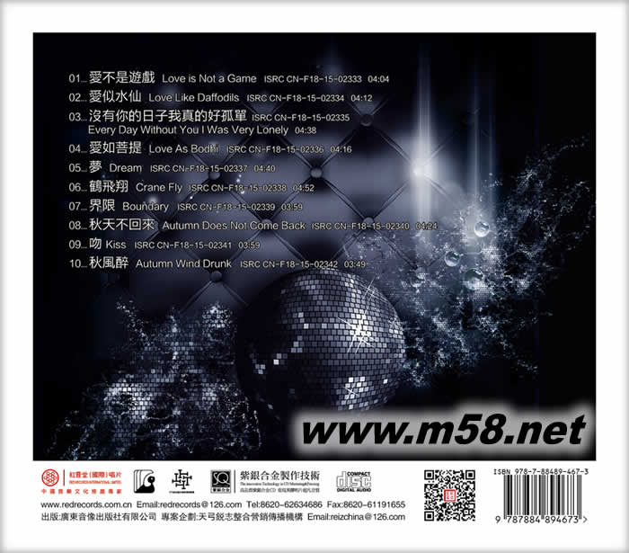 01 愛不是游戲 Love is not a game 作詞:阿坤 胡力 作曲:胡力 02 愛似水仙 Love Like Daffodils 作詞:梁俊睿 胡力 作曲:胡力 03 沒有你的日子我真的好孤單 Every day without you I was very lonely 作詞:王強 作曲:胡力 04 愛如菩提 Love as Bodhi 作詞:胡力 作曲:胡力 05 夢 Dream 作曲:胡力 06 鶴飛翔 Crane fly 作詞:胡力 作曲:胡力 07 界限 Boundary 作曲:胡力 08 秋天不回來 Autumn does not come back 作詞:王強 作曲:胡力 09 吻 Kiss 作曲:胡力 10 秋風醉 Autumn wind drunk 作詞:任延俊 作曲:胡力