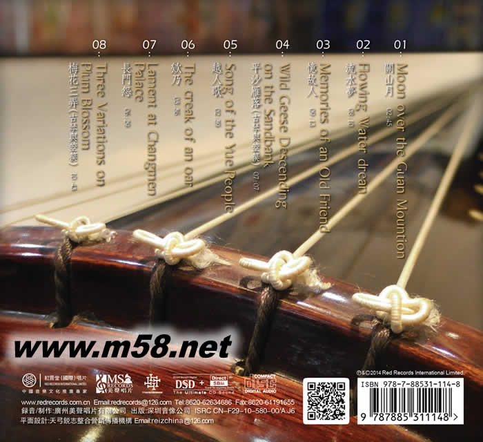 01、關山月 02:45 Moon over the Guan Mountion 02、流水夢 04:47 Flowing Water drean 03、憶故人 09:13 Memories of an Old Friend 04、平沙落雁(古琴與箜篌) 07:07 Wild Geese Descending on the Sandbank 05、越人歌(作曲:譚盾/改編:楊青) 02:59 Song of the Yue People 06、埃乃 05:56 The creak of an oar 07、長門怨 06:30 Lament at Changmen Palace 08、梅花三弄(古琴與箜篌) 10:43 Three Variations on Plum Blossom