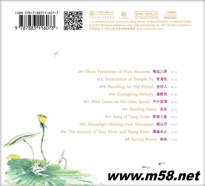 01 梅花三弄 07:18 Three Variations of Plum Blossom 02 普庵咒 05:44 Incantation of Temple Pu 03 憶故人 08:51 Recalling An Old Friend 04 廣陵散 07:20 Guang Lin Melody 05 平沙落雁 08:52 Wild Geese on the Calm Sands 06 流水 06:35 Flowing Water 07 陽關三疊 05:28 Song of Yang Guan 08 關山月 02:29 Moonlight Shining Over Mountain 09 瀟湘水云 11:55 The scenery of Xiao River and Xiang River 10 春風 05:54 Spring Breeze