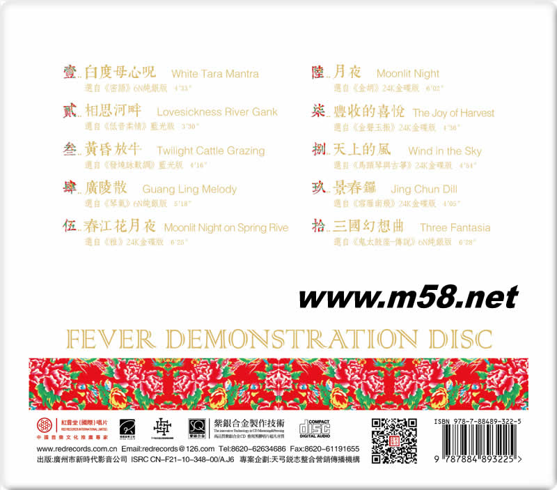 01..白度母心咒 White Tara Mantra 04′33″ 選自《密語》6N純銀版 02..相思河畔 Lovesickness River Gank 03′30″ 選自《低音柔情》藍(lán)光版 03..黃昏放牛 Twilight Cattle Grazing 04′16″ 選自《發(fā)燒詠嘆調(diào)》藍(lán)光版 04..廣陵散 Guang Ling Melody 05′18″ 選自《琴氣》6N純銀版 05..春江花月夜 Moonlit Night on Spring Rive 06′25″ 選自《雅》24K金碟版 06..月夜 Moonlit Night 06′02″ 選自《金胡》24K金碟版 07..豐收的喜悅 The Joy of Harvest 04′36″ 選自《金聲玉振》24K金碟版 08..天上的風(fēng) Wind in the Sky 04′54″ 選自《馬頭琴與古箏》24K金碟版 09..景春鑼 Jing Chun Dill 04′05″ 選自《雪雁南飛》24K金碟版 10..三國幻想曲 Three Fantasia 06′28″ 選自《鬼太鼓座-傳說》6N純銀版