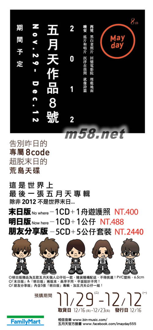 第二人生(朋友分享版)(m58.net) 出版日前匯款的,貨已留好,年初八后待發。 五月天趕在末日前夕 高掛「八號風球」 橫掃樂壇 出道以來最長錄音期煎熬三年 五月天第8張專輯12月壓軸推出 五月天「作品8號 」 「亞洲天團」五月天距離上一張專輯「后青春期的詩」之后已近3年未推出全新專輯,熬不住的歌迷早已迫不及待頻頻上網精神喊話關切新專輯的進度,而10月底電影「星空」同名主題曲搶先曝光之后火速登上網路點播排行榜冠軍,更讓新專輯的詢問度到達沸點!其實今年過完年后,五月天就已正式進入新專輯錄音制作,更早于4月份時就帶著當時創作完成的15首歌第一次前往日本編曲錄音,但五月天求好心切、甚至將許多已經完成編曲的錄音作廢,一路推翻自己直到9月底才完成預計收錄的10首歌曲,好不容易讓經紀人與唱片公司松了一口氣,覺得終于可以如期發片了!沒想到五月天自己又出招,提出延后發片再加歌的堅持,一方面因為錄音過程后期中新的好歌不斷涌現,另一方面五月天認為:3年未發片,跟大家都一樣一張專輯只收10首歌,對耐心等待的歌迷誠意不夠,因此特地爭取時間將原訂11月發行的專輯硬是拉到12月末日前夕壓軸推出,并于最后拍板確定追加多達13首曲目,要讓苦等已久的歌迷「三年不開張,開張吃三年」,大飽耳福!