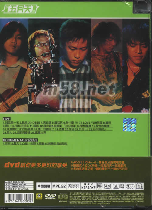 十萬青年站出來-Live巡回演唱會全記錄DVD(m58.net) 單面雙層 隱藏式KARAOKE DVD給你更多更好的享受 AC-3 5.1 Chinnel>>享受百分白現場感覺 隱藏式卡拉OK功能>>與五月天一起唱翻天 多角度選擇功能>>讓你看到不一樣的五月天