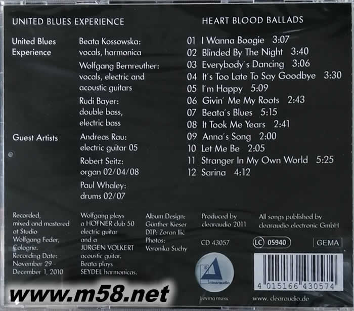 UNITED BLUES EXPERIENCE Heart Blood Ballads (心聲再共鳴)(m58.net) 藍調結他手WOLFGANG BERNREUTHER聯同牛筋老友RUDI BAYER第六張作品,配合女聲BEATA KOSSOWSKA組成為UNITED BLUES EXPERIENCE。近年來推出的藍調結他作品不算多,又像樣、錄音又出眾的更少,UNITED BLUES EXPERIENCE 十二首全新作品,難得的好聽,就如標題所說出一樣,抒情藍調歌曲,男聲、女聲和口琴主、和音。不再一玩再玩前輩所有出名歌曲,自己所創作之作品首首達至可進入經典階級,一下子或許成為后輩的名曲,唔信?還記得B_ella 2004年Track of Heart (心聲共鳴)一碟成名嗎?吸引了無數之發燒樂迷,更吸引了無數結他愛好者,Heart Blood Ballads (心聲再共鳴) 絕對是今年的不二發燒之選。