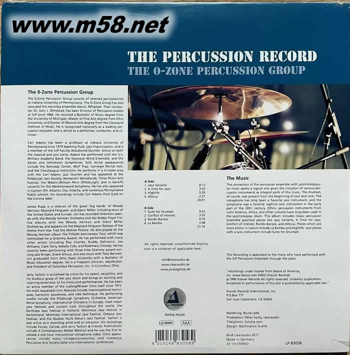 價格為估,以實到貨為準! THE O-ZONE PERCUSSION GROUP 靚聲王 鼓王 黑膠(m58.net) Clearaudio出版的每一張唱膠唱片,均由創辦人兼老闆Peter Suchy一手選材和監制,偶爾也會加入他兩位兒子Patrick與Robert的參與及意見。在過去的LP重刻出品中,鮮有見到Peter Suchy選擇較近代的錄音來重制出版。所以,今次介紹的< The Percussion Record>就令筆者聽得陶醉之外的多一份意外驚喜! 發燒友喜愛採用“Manger-Test CD”(俗稱“靚聲王”)來測試音響體系“力水”都必選播第15首 ,其豐富的敲擊樂聲場面滿載震撼力之馀,各式各樣的敲盤樂器聲效又傳神真實到無倫,全曲錄音播足8分多鐘也令人毫不厭倦煩躁,只會愈聽愈擔心強烈剛勐的聲效動態威力,會否令測試中的音響體系出洋相,喇叭曾否拍曬邊,以此來測試便可得知。假如閣下聽 (Jazz Variants)的“靚聲王”版本能夠過關的話。或者是去“採場”播得過癮?,就一定要試Clearaudio出版的原裝錄音更高燒版本。The O-Zone Percussion Group是由印第安納大學賓州分校的樂手組成,96年于美國細廠Klavier Records(人稱大K)旗下首敞發表,錄音者是鼎鼎大名的Bruce Leek。Clearaudio將原錄音重刻炮制180g黑膠唱片。刪除4首最悶錄音,全新排序,將 放在A面第一首、是B面首曲、壓軸,聲效震撼寰宇,勢必成為最高燒極致敲擊天碟!