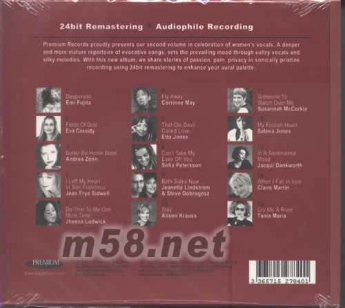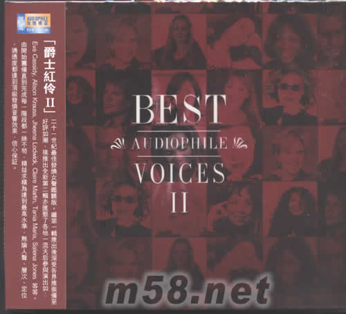 爵士紅伶BEST AUDIOPHILE VOICES第二輯(m58.net) 爵士紅伶,二十世界最佳發燒女聲覽聽版。一張匯聚了世界各地一流天后女星如:CAROL KIDD、 EVA CASSIDY、STACEY KENT 、JHENNA LODWICK、ALISON KRAUSS、JANE MONHEIT等等于一碟。打做了發燒界最佳女聲覽聽版專輯。每位巨星都施展了畢生“嗓藝”,演繹了十五首各國樂迷一致贊賞經典金曲。人聲靚絕、質感強烈、層次分明、定位準確、通透無比音色,加上粒粒巨星名曲,頂級發燒錄制,這份誠意[爵士名伶]大碟,足以令每位發燒樂迷怦然心動。