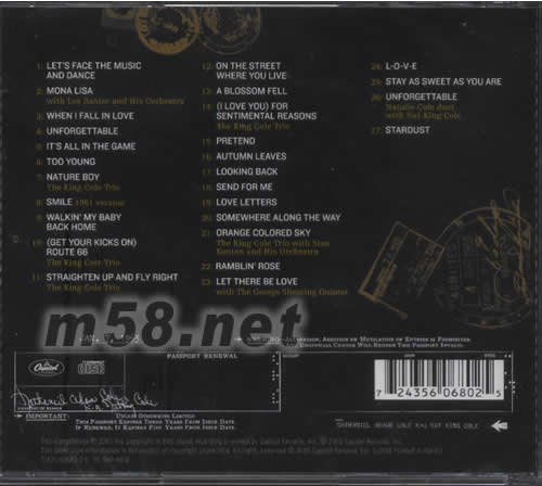 01 LET'S FACE THE MUSIC ANO DANCE 02 MONA LISA 03 WHEN I FALL IN LOVE 04 UNFORGETTABLE 05 IT'S ALL IN THE GAME 06 TOO YOUNG 07 NATURE 08 SMILE 09 WALKIN MY BABY BACK HOME 10 (GET YOUR KICKS ON) ROUTE 66 11 STRAIGHTEN UP AND FLY RIGHT 12 ON THE STREET WHERE YOU LIVE 13 A BLOSSOM FELL 14 (I LOVE YOU)FOR SENTMENTAL REASONS 15 PRETEND 16 AUTUMN LEAVES 17 LOKKING BACK 18 SEND FOR ME 19 LOVE LETTERS 20 SOMEWHERE ALONG THE WAY 21 ORANGE COLORED SKY 22 RAMBLIN'ROSE 23 LET THERE BE LOVE 24 L-O-V-E 25 STAY AS SWEET AS YOU ARE 26 UNFORGETTABLE 27 STARDUST