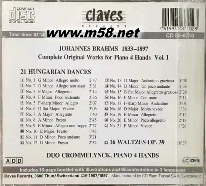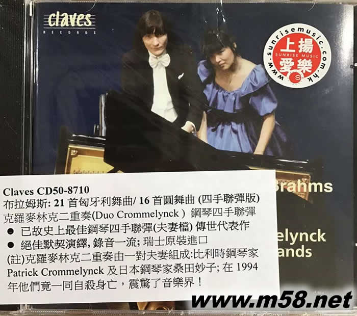 布拉姆斯: 21首匈牙利舞曲/ 16首圓舞曲 (四手聯彈版)Brahms: Complete Original Works for Piano 4 Hands Vol. I(m58.net) 已故史上最佳鋼琴四手聯彈(夫妻檔) 傳世代表作 絕佳默契演繹, 錄音一流; 瑞士原裝進口 (註)克羅麥林克二重奏由一對夫妻組成:比利時鋼琴家 Patrick Crommelynck 及日本鋼琴家桑田妙子; 在1994年他們竟一同自殺身亡,震驚了音樂界!