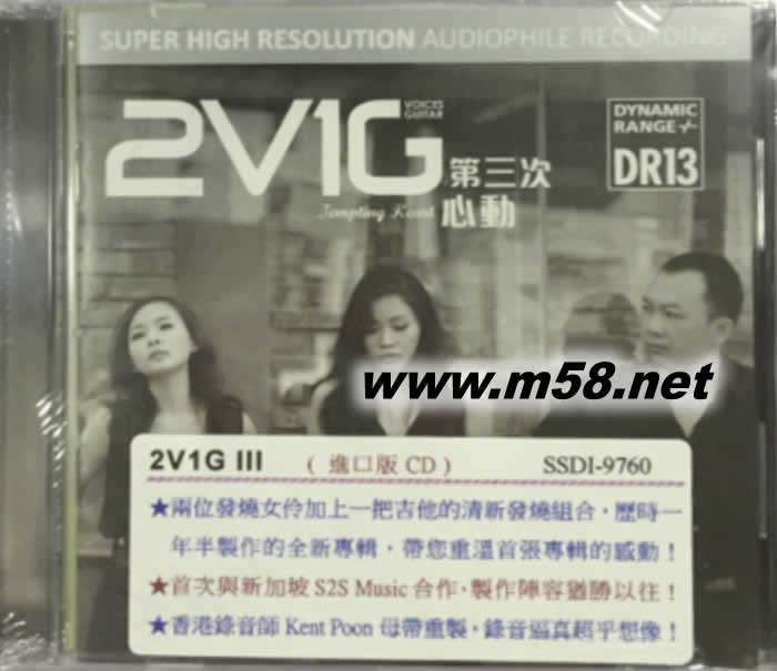 第三次心動(m58.net) 馬來西亞中文歌壇清流, 14年不滅神話: 2V1G,由新生代歌手 Yuii + Kate 延續 顏值, 活力,青春,全新姿態, 從新出發 橫跨4代, 5個女歌手齊聚,各展特色,5花爭艷: 何蕓妮 Winnie 溫婉細膩 戴麗津 Regine 抒情療愈 張盈慧 Serena 淡淡幽情 陳靜宜 Yuii 甜美嘹亮 曾愷婷 Kate 柔情似水 Remaster 人聲和吉他聲音色絕美, 細膩有光澤,層次分明 甜蜜, 苦澀, 悲傷,寂寞, 慰籍, 五味雜陳的情感世界, 2V1G傳承翻新, 回味無窮