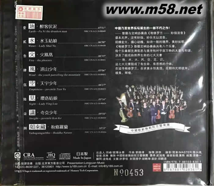 袍修羅蘭 吳琳及樂隊 箜篌協奏曲 UHQCD 限量版(m58.net) 一個獨有兼具中西方樂器特征的傳奇——箜篌 龍源重磅推出箜篌與管弦樂隊完美交響專輯 既表現了中國民族樂器的獨奏音色,又發揮了西方樂器的復合音響 中國乃至世界樂壇誕生的一部不朽之作! --箜篌與交響協奏曲《袍修羅蘭--妙指流音》。 譜本無聲,沒有妙指,妙樂無以流音。 規模宏大,攝心動魄,如詩一般的境界,美妙如歌。 《袍修羅蘭》箜篌交響協奏曲共有八個樂章, 每個樂章都充滿哲思與美學和對宇宙萬物的大愛與和諧。 涉及了組成自然界生命的七大元素 ——地、水、火、風、空、見、識 這七大元素組成了有生命、有思想的個體。
