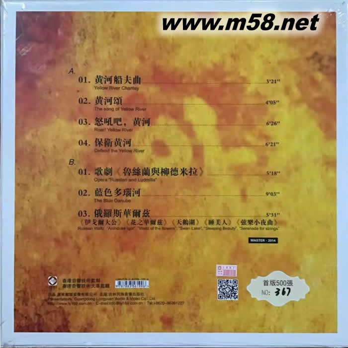 Side A 1、黃河船夫曲 2、黃河頌 3、怒吼吧,黃河 4、保衛黃河 Side B 1、歌劇《魯絲蘭與柳德米拉》 2、藍色多瑙河 3、俄羅斯華爾茲(《伊戈爾大公》《花之華爾茲》《天鵝湖》《睡美人》《弦樂小夜曲》)