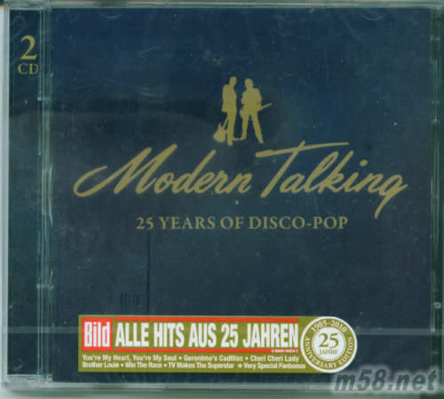 迪斯可年代-冠軍單曲精選25 Years Of Disco-Pop 歐州版(m58.net) ◎風靡80年代歐洲舞曲天王團體2010年最新精選 ◎收錄You`re My Heart, You`re My Soul,紅遍全球的Brother Louie、Cheri, Cheri Lady等32首暢銷歌曲 ◎獨家收錄長達20分鐘的混音舞曲Space Mix `98 來自德國的Modern Talking成軍於1983年,主唱Thmas Anders以出眾的外型與夢幻迷人的嗓音,加上Dieter Bohlen旋律性極佳的作曲能力,兩人一同打造的舞曲金曲不計其數,80年代在MV的推波助瀾之下,摩登語錄風靡寶島,一時無兩,成為歐陸舞曲的天王團體。本精選收錄32首暢銷歌曲,包括1984年推出的首支單曲You`re My Heart, You`re My Soul,紅遍全球的Brother Louie、Cheri, Cheri Lady,獨家收錄多首舞廳混音單曲以及一首長達21分鐘的98年Space Mix超級舞曲。 (無歌詞)