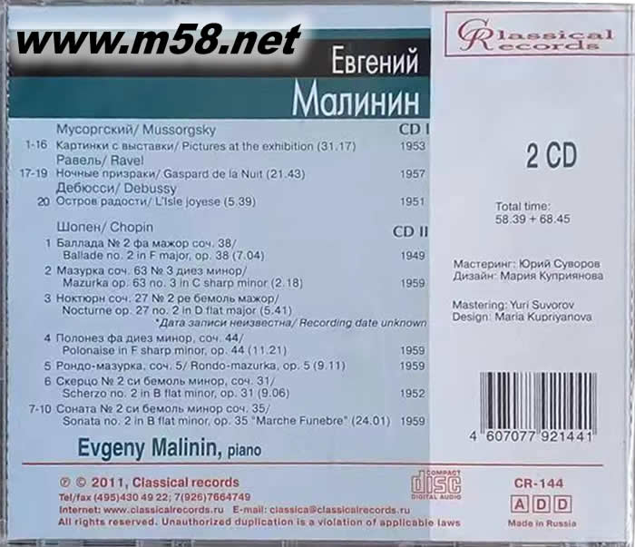 plays Mussorgsky/ Ravel/ Debussy/ Chopin 馬利寧 - 鋼琴藝術(shù)(m58.net) 師從俄羅斯鋼琴大師涅高茲 (Henry Neighaus), 曾獲獎多項國際大賽(蕭邦鋼琴大賽、隆.提博大賽..) 珍稀私房錄音, 超技浪漫演繹 [曲目] 穆索斯基:圖畫展覽會/拉威爾: 加斯巴之夜/德布西: 快樂島/蕭邦: 敘事曲/ 馬祖卡舞曲/ 夜曲/波蘭舞曲/迴旋曲/詼諧曲/ 葬禮奏鳴曲(op.35)