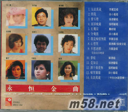 01. 友誼萬歲 -李麗蕊 02. 問我 -徐小鳳 03. 紫玉墜 -張德蘭 04. 南屏晚鐘 -張明敏 05. 紅燭淚 -薰妮 06. 分飛燕 -徐小鳳 07. 我是癡情無限 -李麗蕊 08. 心想哭 -葉德嫻/張偉文 09. 不想迷惘(原曲南屏晚鐘) -方麗盈 10. 夢痕 -蘇珊 11. 覓知音 -張德蘭 12. 酒干倘賣無 -張明敏 13. 啼笑姻緣 -徐小鳳 14. 友誼萬歲 (卡拉OK版音樂)
