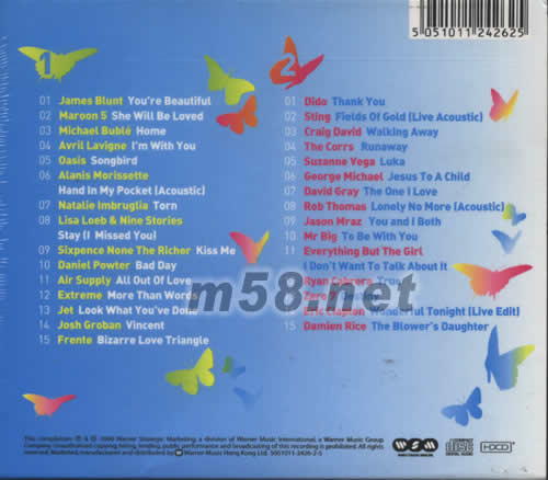 1 James Blunt- You're Beautiful 2 Maroon 5- She Will Be Loved 3 Michael Buble- Home 4 Avril Lavigne- I'm With You 5 Oasis- Songbird 6 Alanis Morissette- Hand In My Pocket (Acoustic) 7 Natalie Imbruglia- Torn 8 Lisa Loeb & Nine Stories- Stay (I Missed You) 9 Sixpence None The Richer- Kiss Me 10 Daniel Powter- Bad Day 11 Air Supply- All Out Of Love 12 Extreme- More Than Words 13 Jet- Look What You've Done 14 Josh Groban- Vincent 15 Frente- Bizarre Love Triangle 1 Dido- Thank You 2 Sting- Fields Of Gold (Live Acoustic) 3 Craig David- Walking Away 4 The Corrs- Runaway 5 Suzanne Vega- Luka 6 George Michael- Jesus To A Child 7 David Gray- The One I Love 8 Rob Thomas- Lonely No More (Acoustic) 9 Jason Mraz- You and I Both 10 Mr. Big- To Be With You 11 Everything But The Girl- I Don't Want To Talk About It 12 Ruan Cabrera- True 13 Ryan Cabrera- True 14 Eric Clapton- Wonderful Tonight (Live Edit) 15 Damien Rice- The Blower's Daughter