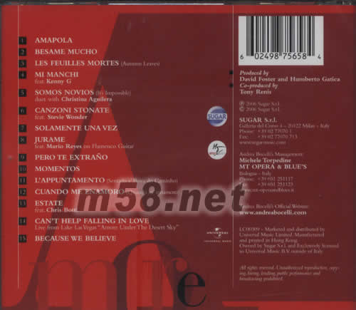 1.AMAPOLA 2.BESAME MUCHO 3.LESFEUILLES MORTES(AUTNMN LEAVES) 4.MI MANCHI 5.CSOMOS NOVIOS(IT'S IMPOSSIBLE) 6.CANZONI STONATE 7.SOLAMENTE UNA VEZ 8.JURAME 9.PERO TE EXTRANO 10.MOMENTOS 11.LAPPUNTAMENTO(SENTADO A'BEIRA DO CAMINHO) 12.CUANDO ME ENAMORO(QUANDO M'INNAMORO) 13.ESTATE 14.CAN'T HELP FALLING IN LOVE 15.BECAUSE WE BELIEVE