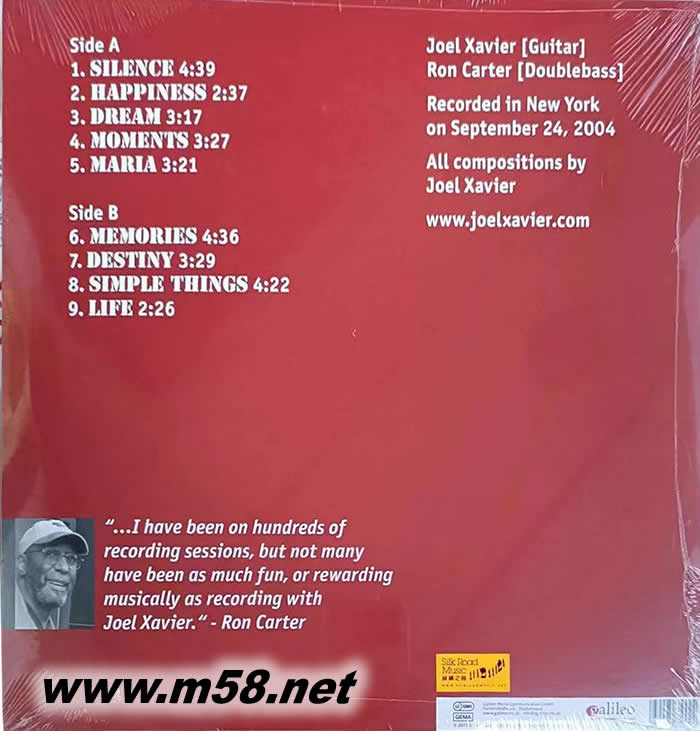 葡萄牙吉它手在紐約唱歌 In New York 黑膠(m58.net) Joel Xavier (結他及主唱) Ron Carter (低音大提琴) 1. 1974年出生于葡萄牙里啊斯本(Lisbon),十九歲時于美國音樂商人商會(National Association of Music Merchants)所舉辦的結他比賽摘得桂冠,并推選為年度在美國最佳五大結他手之一的喬伊‧澤維爾(Joel Xavier),嶄露頭角已備受矚目。隨著他的指彈技巧日趨熟練,持續的高水平表現令他于1997年被許為"全球最佳拉丁結他手(Best Latin Guitar Players in The World)"之一,與當時的拉里‧科耶爾(Larry Coryell)、伯瑞利‧拉葛蘭(Bireli Lagrene)、托瑪蒂托(Tomatito)、路易斯‧薩利納斯(Luis Salinas)及瑞恩‧托萊多(Rene Toledo)等大師的級樂手齊名,杰出的演奏技巧,廣受認同,亦奠定了他在國際樂壇的重要地位。 2. 澤維爾除了擅長演繹葡萄牙音樂外,他對充滿動力和節奏感的巴西和非洲的音樂亦鍾愛非常,而爵士樂亦是他的所好,他的作品亦融入不少這些樂種的元素,內容豐富,可聽性極高。 3. 曾三度獲得格萊美獎(Grammy Awards),美國傳奇爵士樂低音大提琴手朗‧卡特(Ron Carter)以精湛的拉奏技巧和對樂曲的深切理解和鑑賞力以作詮釋,全情投入的演奏可説是"人琴合一"的典范,亦是樂迷對這位爵士樂大師留下深刻印象的主要原因。 4. 澤維爾與卡特攜手于2004年9月底在美國紐約曼克頓(Manhattan)破天荒作首度合作制作專輯《在紐約(In New York)》,他們演奏了九首澤維爾譜寫的精心杰作。這些歌曲融合了葡萄牙的“法多(fado)”音樂和爵士樂,旋律優美柔和,悠揚悅耳。清晰飽滿的尼龍結他聲,與哀怨動人的低音大提琴相伴隨,配以33 1/3轉,180克處女黑膠盤為載體,營造出真實自然,回味無窮的鑑賞盤。