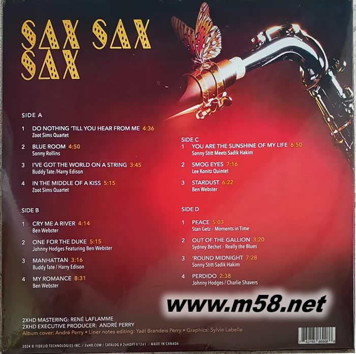 大師色士風 SAX SAX SAX 黑膠(m58.net) 優秀的色士風演奏家包括Ben Webster、Sonny Rollins、Zoot Sims、Stan Getz、Lee Konitz等等。正如一場色士風盛宴,聽得手舞足蹈。這傳奇套裝,由10張專輯中收集得來的15個精彩表演。從最初只集結成專輯供下載購買,短時間成為下載榜的名列前茅,更被評介是靚聲又好聽,要聽抖動效果的顫音,吹到水花四濺,結合泛音與特殊的指法,用來炫技之超高音等等技巧,不會失望。AAA 100%純類比制作,加拿大2xHD使用Nagra(南瓜)專業級裝置進行母帶處理,重本在Bernie Grundman Mastering(博尼·葛朗德曼錄音室)以33 1/3RPM進行模擬剪輯。